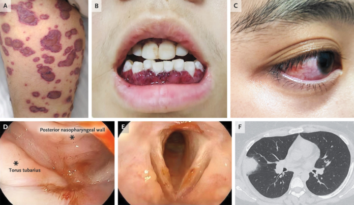 During hospitalization, the patient developed fever, dyspnea, and hemoptysis. Endoscopic evaluation revealed friable, hemorrhagic nasopharyngeal mucosa and ulcerated laryngeal tissue, consistent with upper airway involvement. GPA frequently affects the nasal cavity, sinuses, and larynx, leading to epistaxis, crusting, ulceration, and subglottic stenosis. Pulmonary involvement was confirmed by computed tomography, which demonstrated bilateral lung nodules. Pulmonary nodules, which may cavitate, are a hallmark of GPA and are often associated with hemoptysis.
