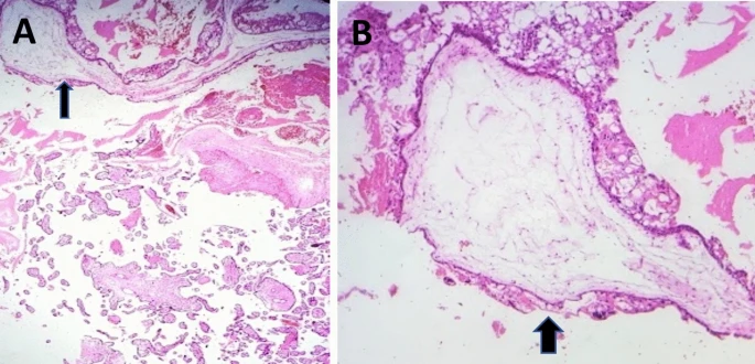 Microscopic examination of the placenta revealed enormous hydropic villi with cistern development, scalloping. And peripheral trophoblastic proliferation, interspersed with normal and tiny villi, as well as fibrotic villi consistent with partial molar pregnancy.